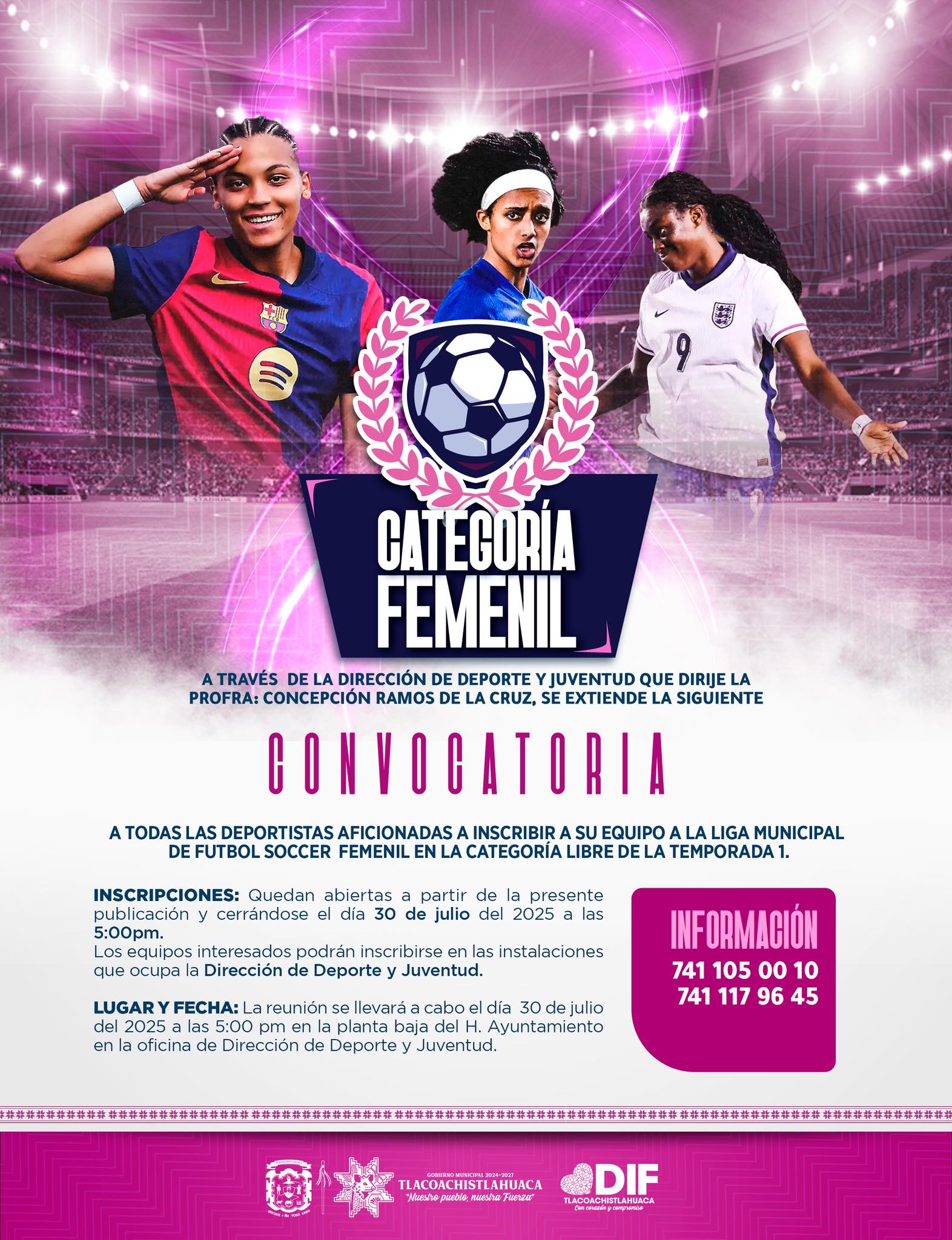 El Gobierno Municipal de Tlacoachistlahuaca, encabezado por el Arq. Emmanuel Cuevas Rodríguez, a través de la Dirección de Deporte y Juventud, a cargo de la Lic. Concepción Ramos de la Cruz, invita a todas las mujeres deportistas a participar en el Torneo de la Liga Municipal de Fútbol – Categoría Femenil. 🙋‍♀️🔥