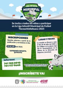 El H. Ayuntamiento de Tlacoachistlahuaca, que encabeza el Arq. Emmanuel Cuevas Rodríguez, a través de la Dirección de Deporte y Juventud, a cargo de la Lic. Concepción Ramos de la Cruz, invita a todos los niños y niñas deportistas a inscribirse en el torneo de la Liga Municipal de Fútbol, categoría infantil.