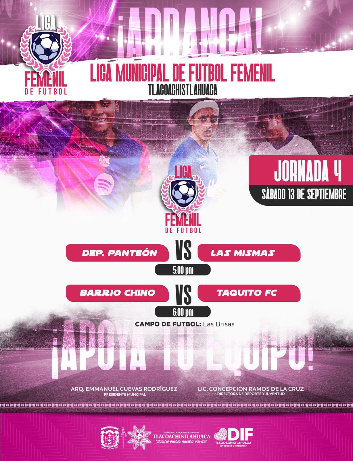 El Gobierno Municipal de Tlacoachistlahuaca, que encabeza el Arq. Emmanuel Cuevas Rodríguez, a través de la Dirección de Deporte y Juventud, invita a disfrutar de los emocionantes encuentros de la Jornada 4 de la Liga Femenil Municipal: