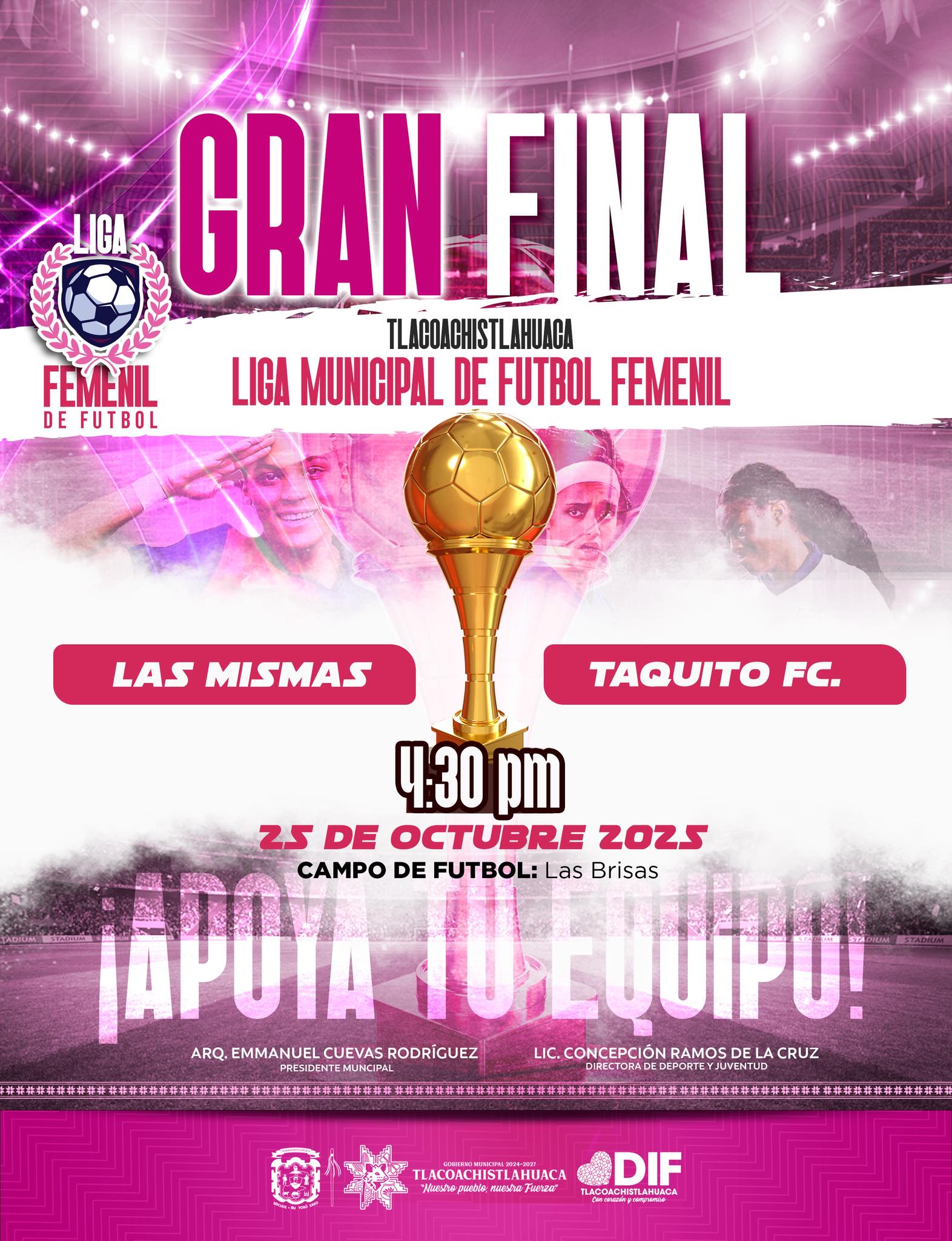 El H. Ayuntamiento de Tlacoachistlahuaca, que preside el Arq. Emmanuel Cuevas Rodríguez, a través de la Dirección de Deporte y Juventud, a cargo de la Profa. Concepción Ramos de la Cruz, llevó a cabo la Gran Final de la Liga Municipal de Fútbol Femenil, un emocionante encuentro lleno de pasión, entrega y talento.