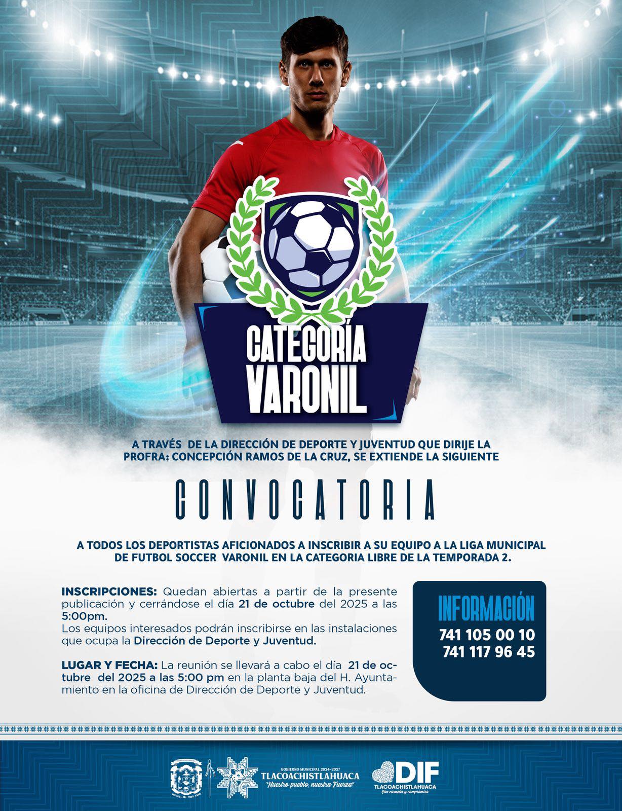 El Gobierno Municipal de Tlacoachistlahuaca, encabezado por el Arq. Emmanuel Cuevas Rodríguez, a través de la Dirección de Deporte y Juventud, a cargo de la Lic. Concepción Ramos de la Cruz, invita a todos los jugadores aficionados a participar en el Torneo de la Liga Municipal de Fútbol – Categoría Varonil. 🙋‍♂️🔥