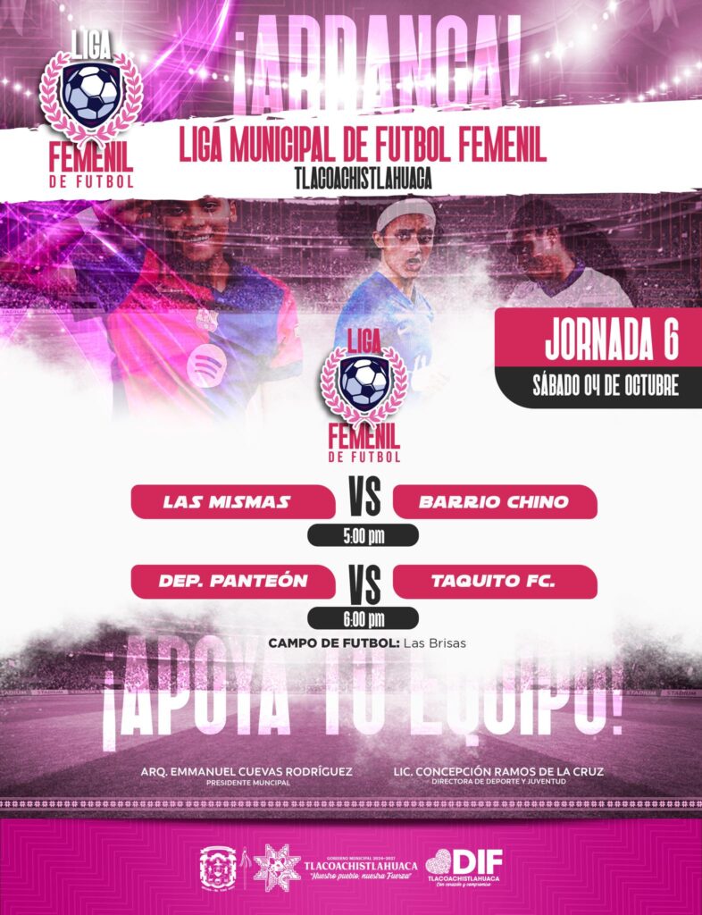 El Gobierno Municipal de Tlacoachistlahuaca, encabezado por el Arq. Emmanuel Cuevas Rodríguez, a través de la Dirección de Deporte y Juventud, invita a toda la ciudadanía a disfrutar de los emocionantes encuentros de la Jornada 6 de la Liga Femenil: