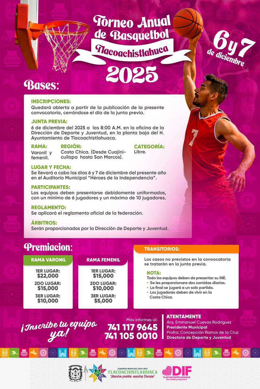El Gobierno Municipal de Tlacoachistlahuaca, encabezado por el Arq. Emmanuel Cuevas Rodríguez, a través de la Dirección de Deportes y Juventud, convoca a todos los equipos, jugadores y entusiastas del baloncesto de la Costa Chica a formar parte del Torneo Anual de Básquetbol 2025.