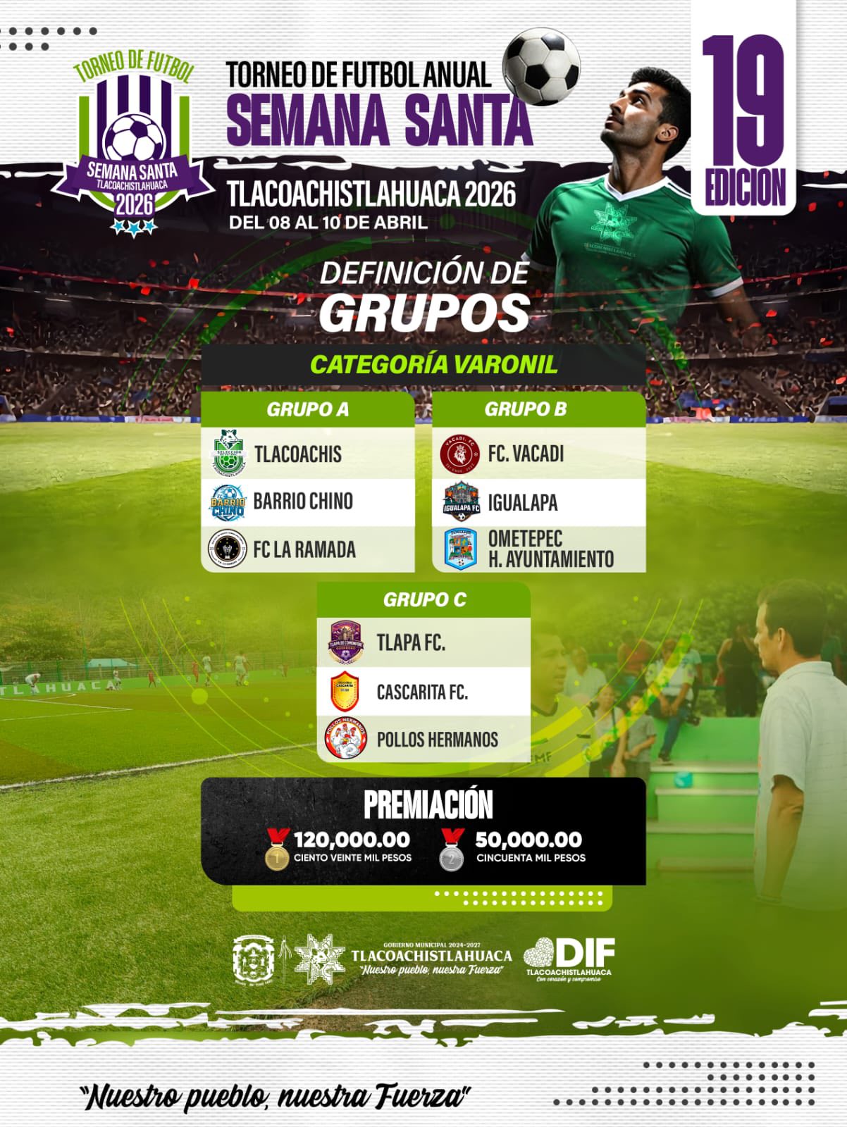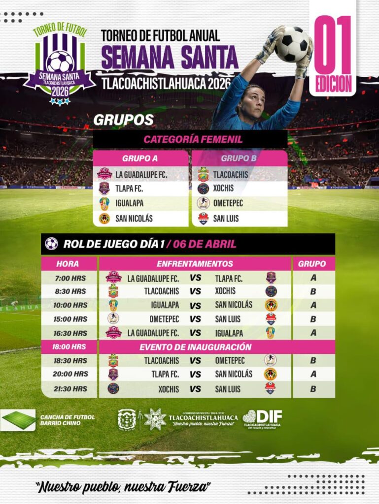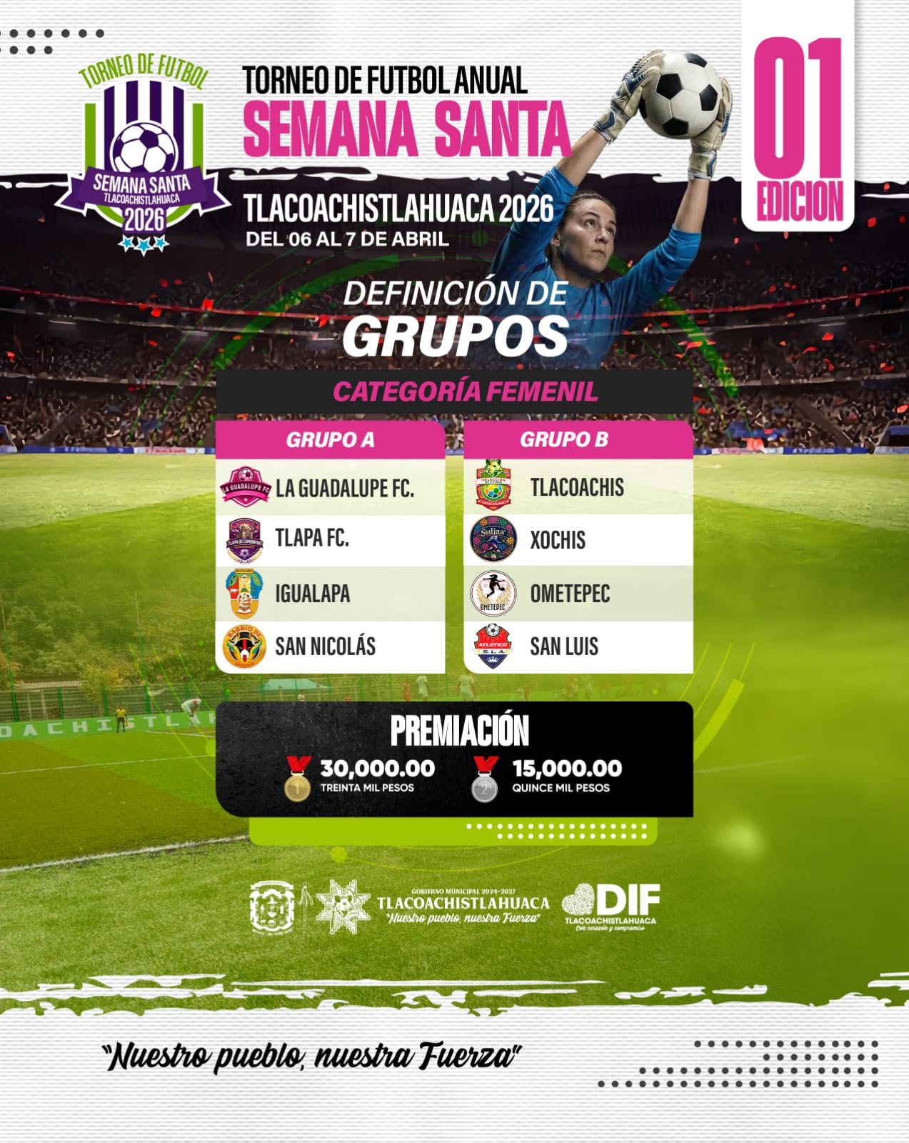 El Gobierno Municipal de Tlacoachistlahuaca invita a la ciudadanía a disfrutar del Torneo de Fútbol Anual Semana Santa 2026, en su categoría femenil, fomentando la participación deportiva y la sana convivencia.