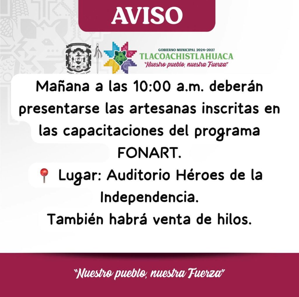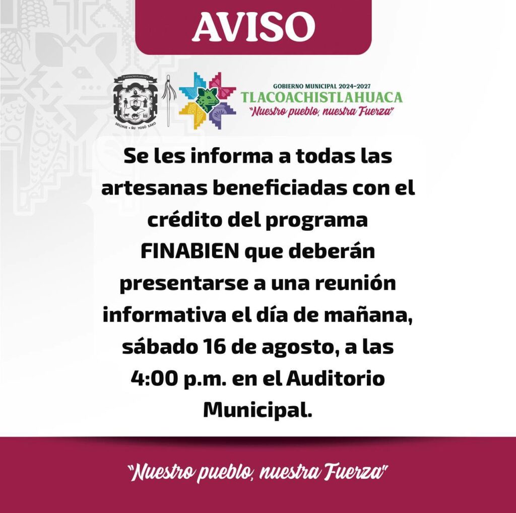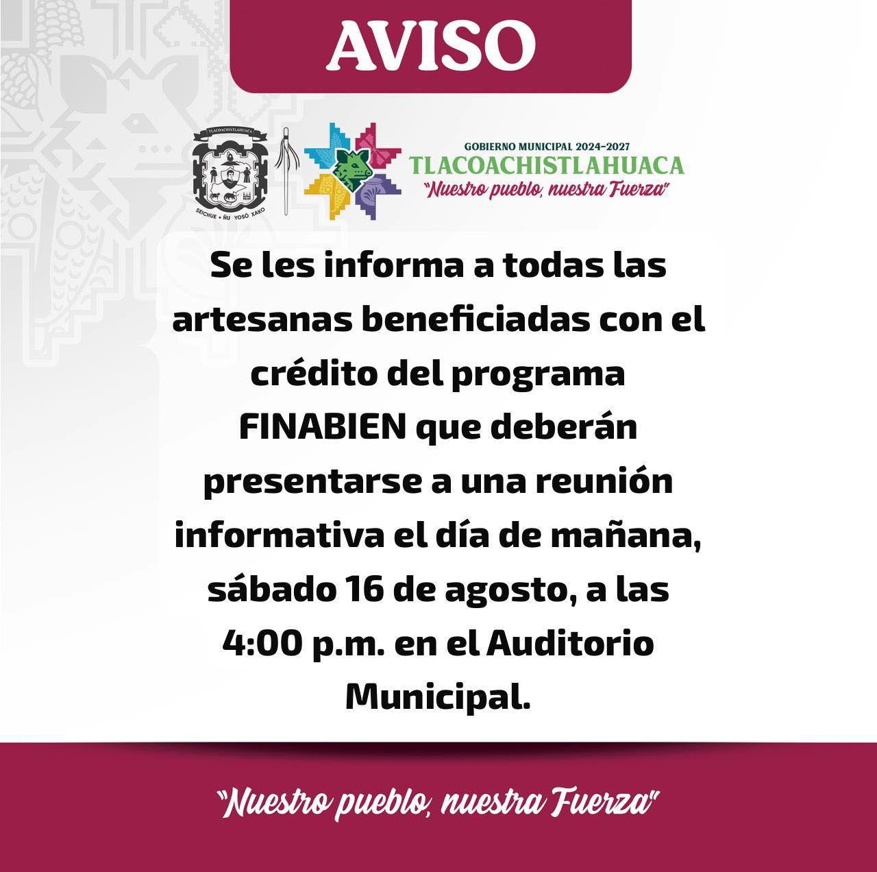 Se les informa a todas las artesanas beneficiadas con el crédito del programa FINABIEN que deberán presentarse a una reunión informativa el día de mañana, sábado 16 de agosto, a las 4:00 p.m. en el Auditorio Municipal.