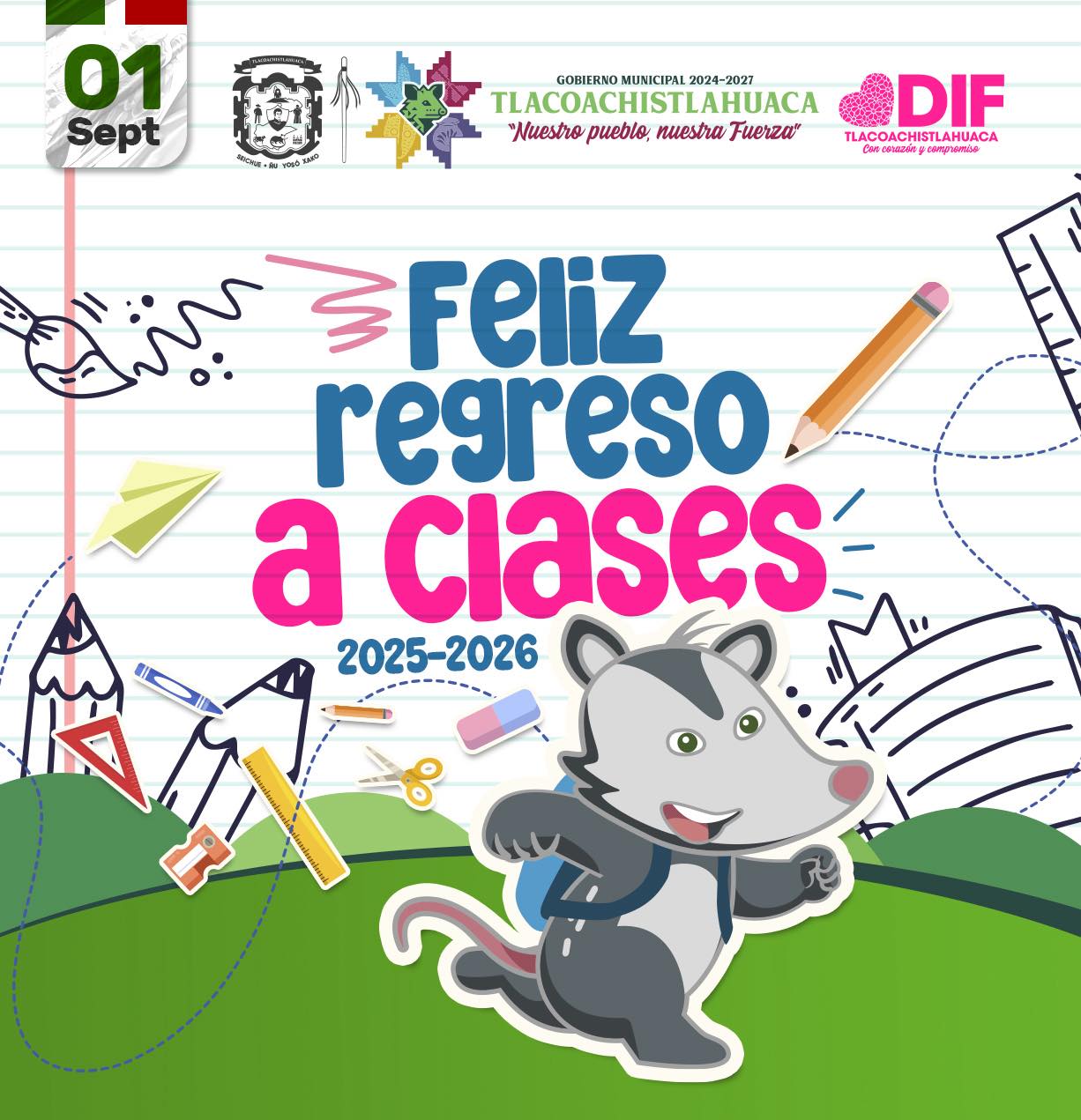 El Gobierno Municipal de Tlacoachistlahuaca, que encabeza el Arq. Emmanuel Cuevas Rodríguez, envía un afectuoso saludo y los mejores deseos a todas las niñas, niños y jóvenes que hoy inician una nueva etapa escolar llena de aprendizajes, retos y sueños por cumplir.