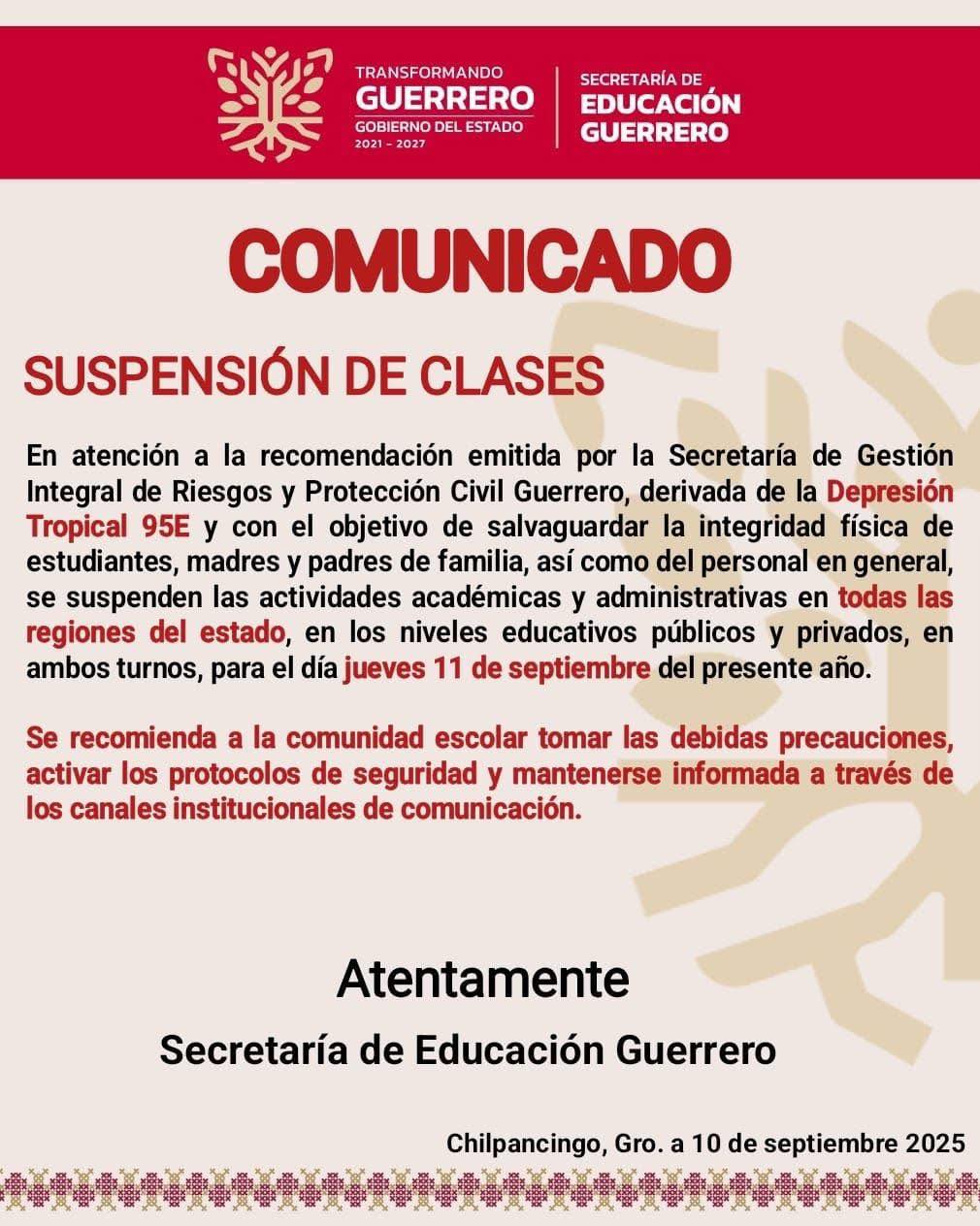 #Comunicado| Atención comunidad escolar, este jueves 11 de septiembre se suspenden clases en todas las regiones del estado de Guerrero, por la depresión tropical 95E.