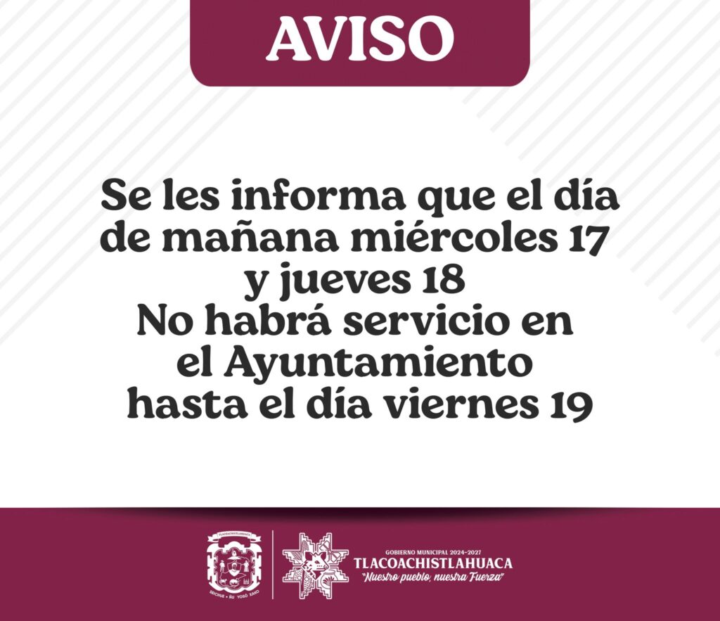 El Gobierno de Tlacoachistlahuaca informa a la población que, de acuerdo con el comunicado emitido por la Comisión Federal de Electricidad (CFE), este domingo 31 de agosto se llevarán a cabo trabajos de mantenimiento en la línea de transmisión Papagayo, lo que implicará la suspensión temporal del servicio eléctrico en varios municipios de la región Costa Chica, incluido el nuestro.