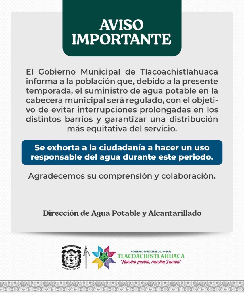 AGUA POTABLE – AVISO IMPORTANTE PARA LA CIUDADANÍA DE TLACOACHISTLAHUACA