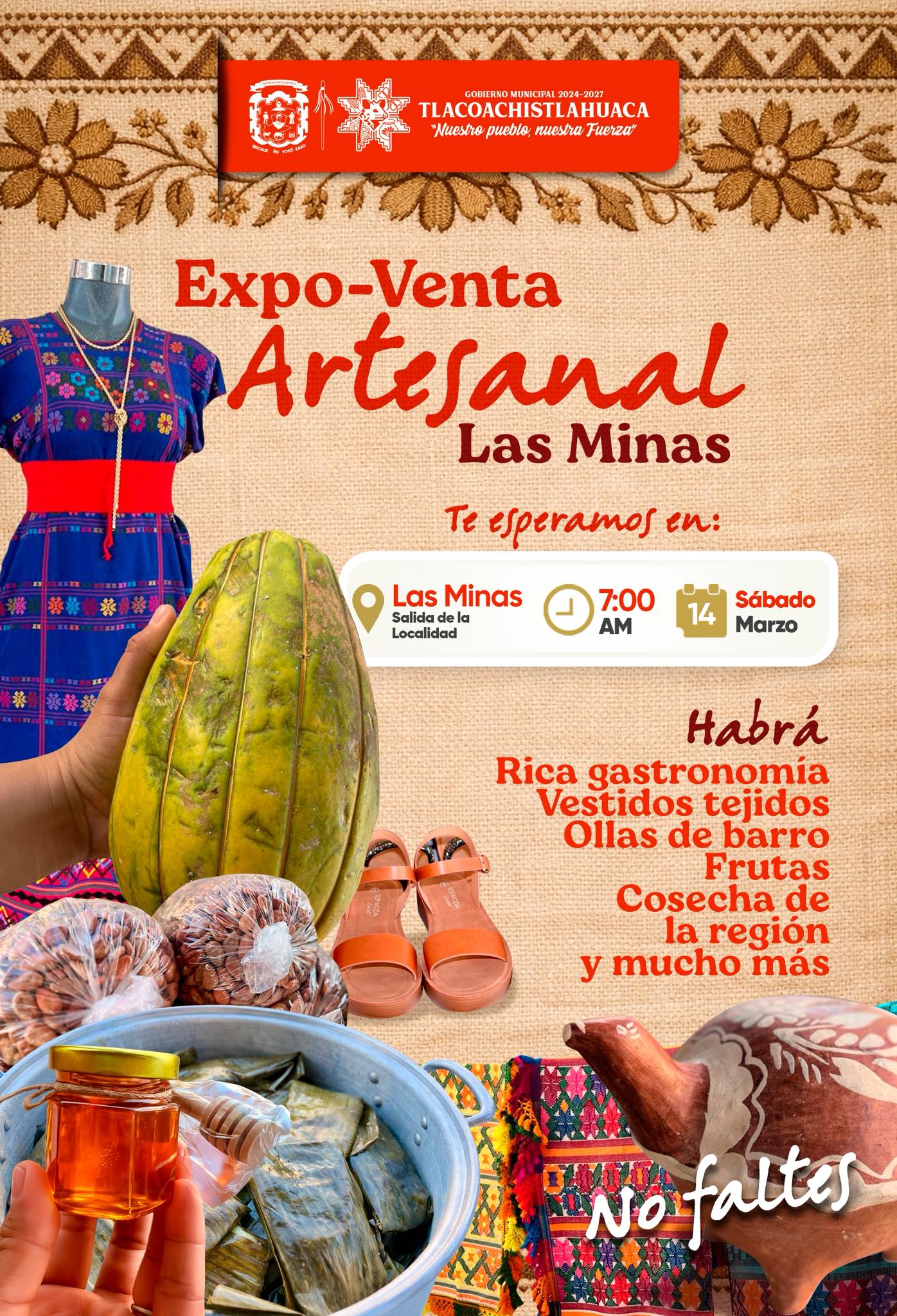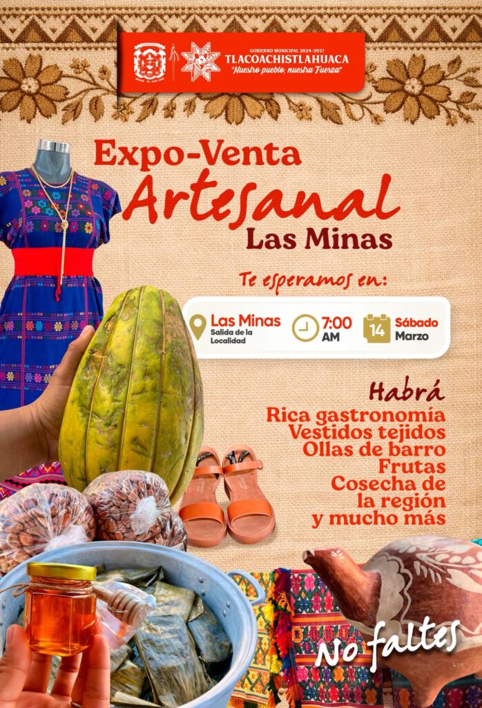 El Gobierno Municipal de Tlacoachistlahuaca, que encabeza el Arq. Emmanuel Cuevas Rodríguez, en coordinación con la dirección de cultura y turismo, invita a la ciudadanía a asistir a la Expo–Venta Artesanal que se llevará a cabo en la localidad de Las Minas.