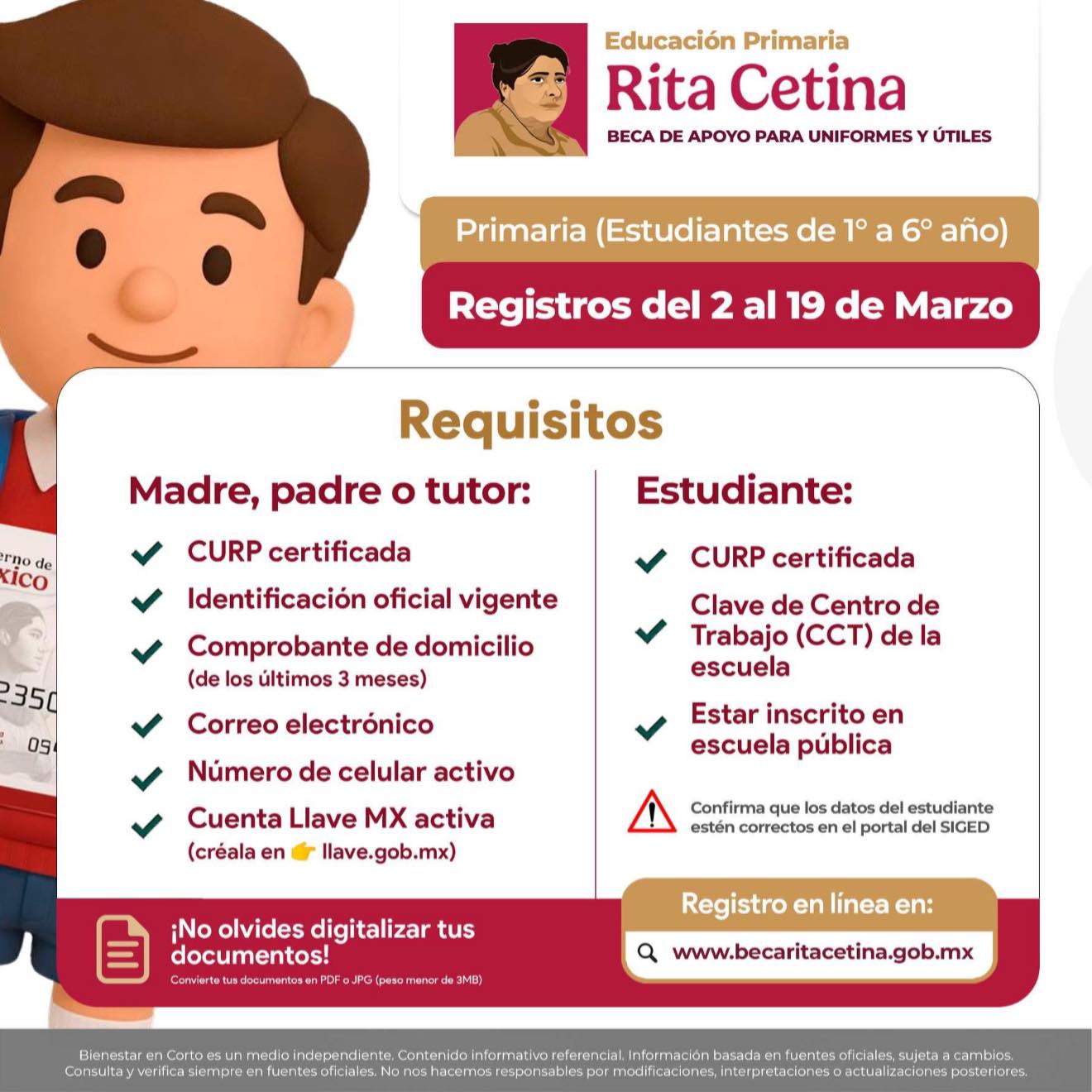 El H. Ayuntamiento de Tlacoachistlahuaca, que dirige el presidente municipal, Arq. Emmanuel Cuevas Rodríguez, a través de la Coordinación de Asuntos Indígenas, Migrantes y Bienestar, en coordinación con la Oficina de Bienestar de Tlacoachistlahuaca, invita a mamá, papá o tutor de las comunidades de San José Rancho Limón, Mamey y Juquila Yucucani que aún no han realizado su registro a la Beca Rita Cetina