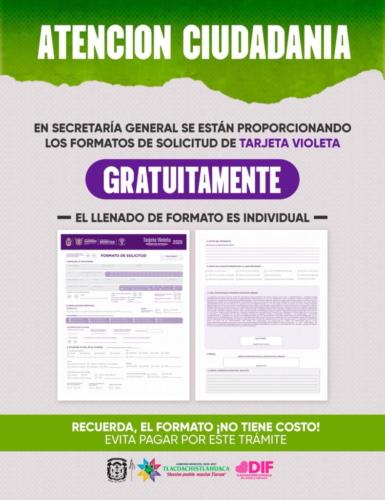 El Gobierno de Tlacoachistlahuaca informa que, a través de la Secretaría General, se están proporcionando de manera gratuita los formatos de solicitud para la Tarjeta Violeta.