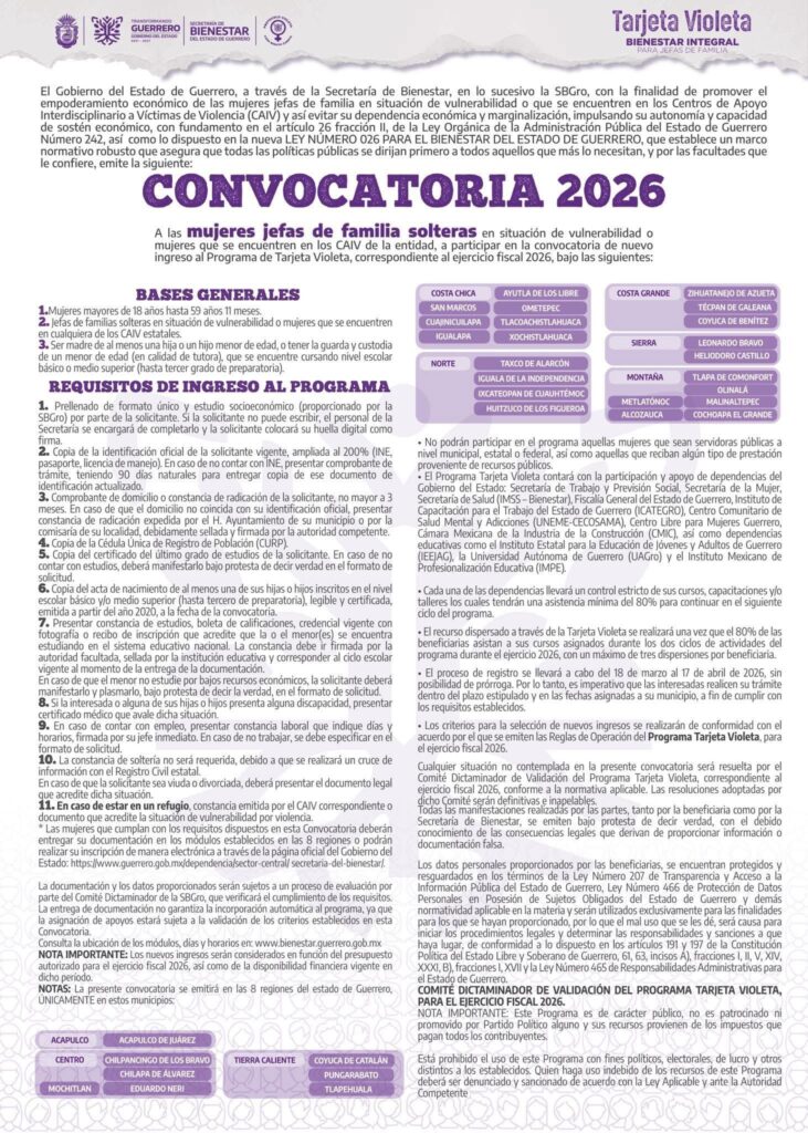 En Guerrero seguimos impulsando acciones que fortalecen la autonomía y el bienestar de las mujeres. Por ello, el Gobierno del Estado, bajo la visión de nuestra gobernadora Evelyn Salgado Pineda, presenta la #Convocatoria2026 de la Tarjeta Violeta, un programa que brinda respaldo directo a mujeres guerrerenses para apoyar su economía y la de sus familias.