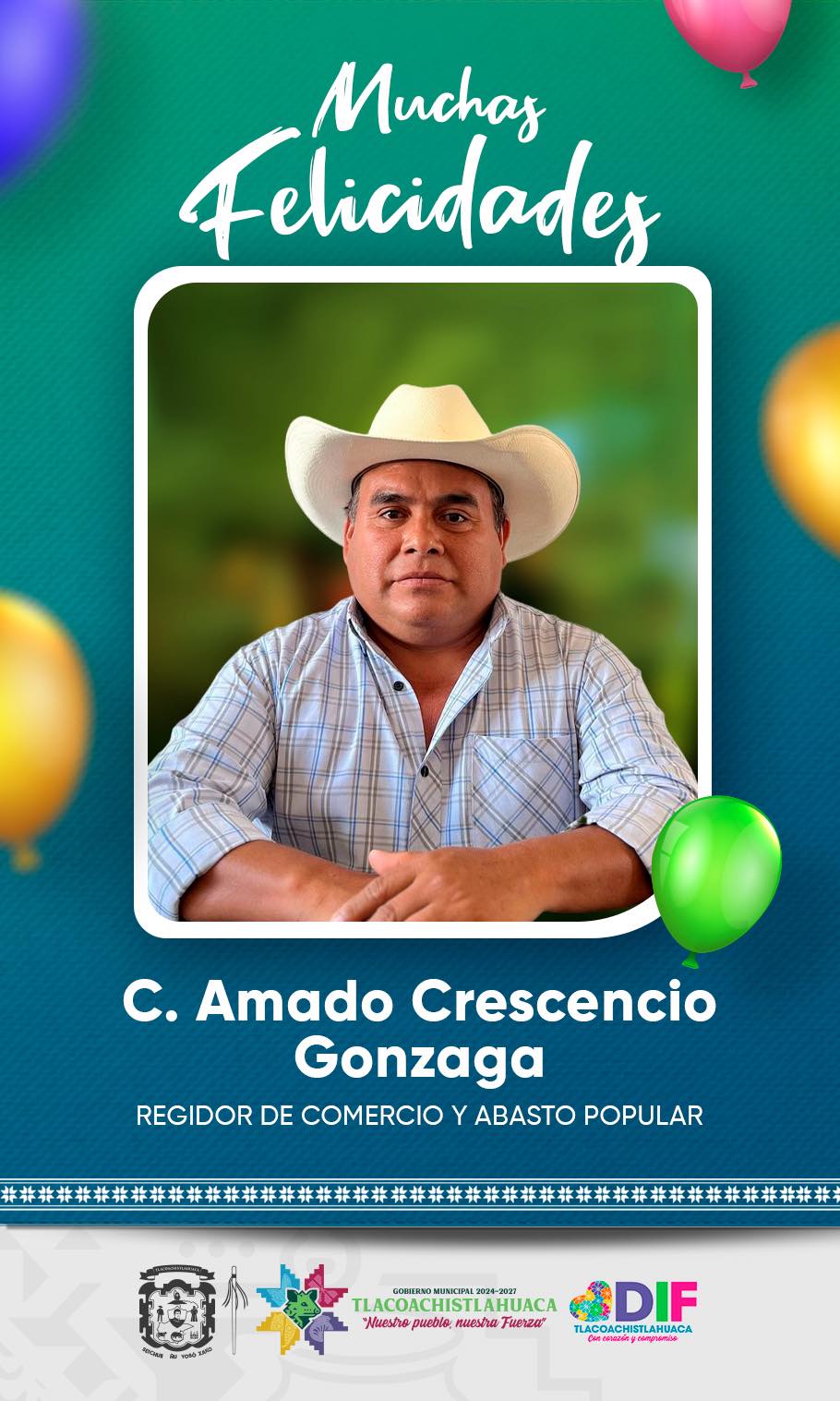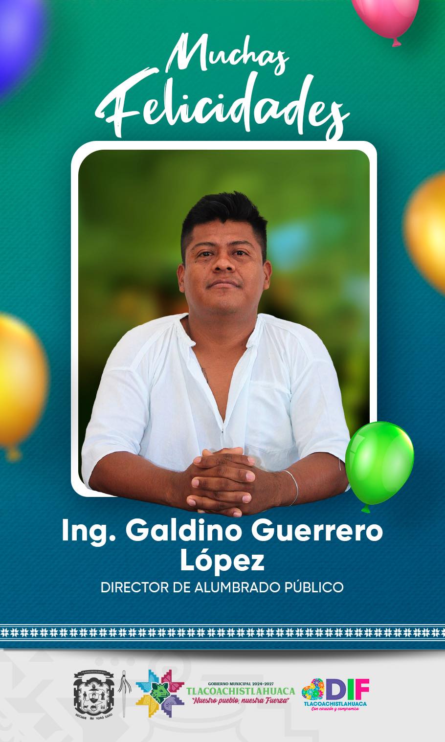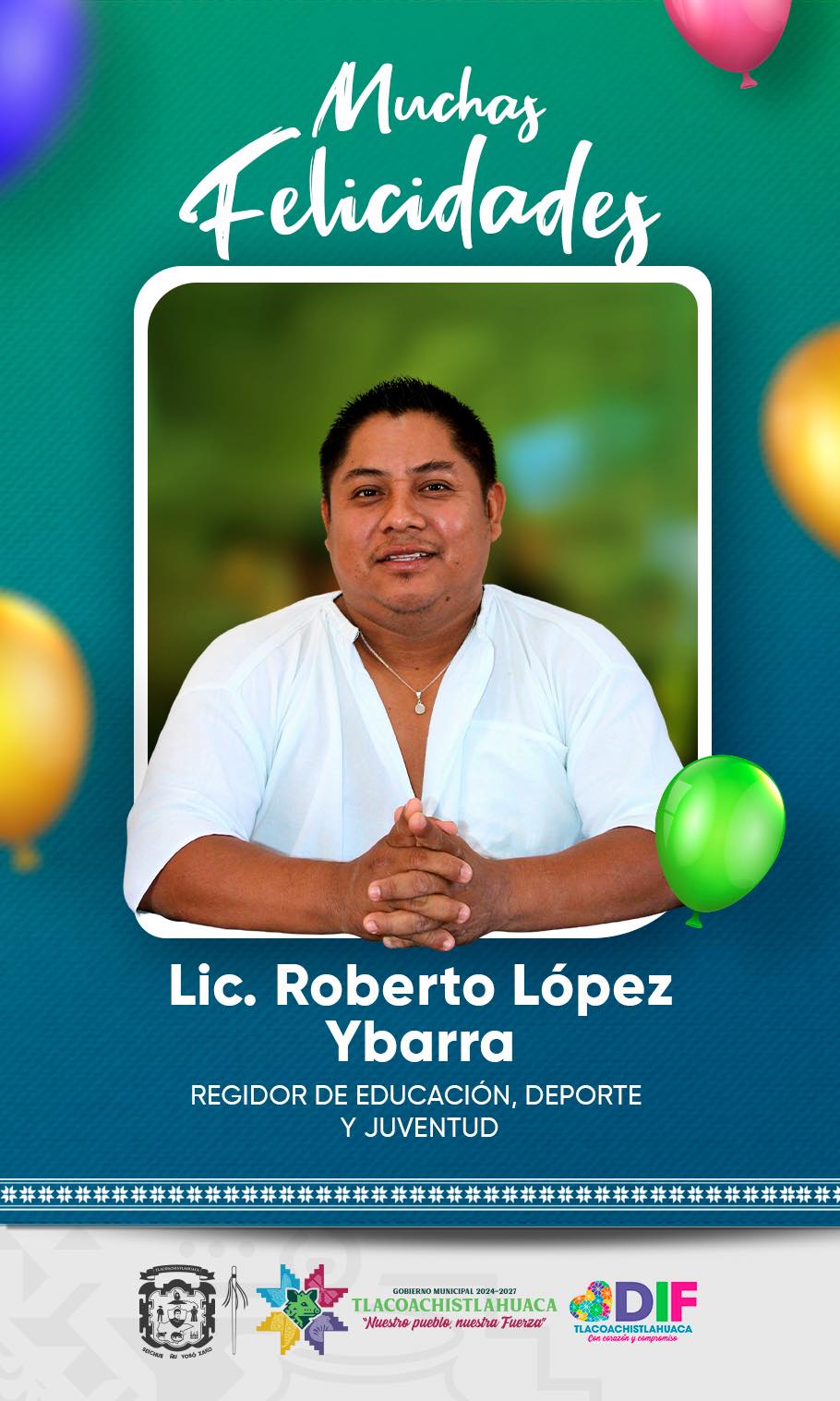 El Gobierno Municipal de Tlacoachistlahuaca envía una felicitación al Regidor de Educación, Deportes y Juventud, Prof. Roberto López Ybarra, con motivo de su cumpleaños.