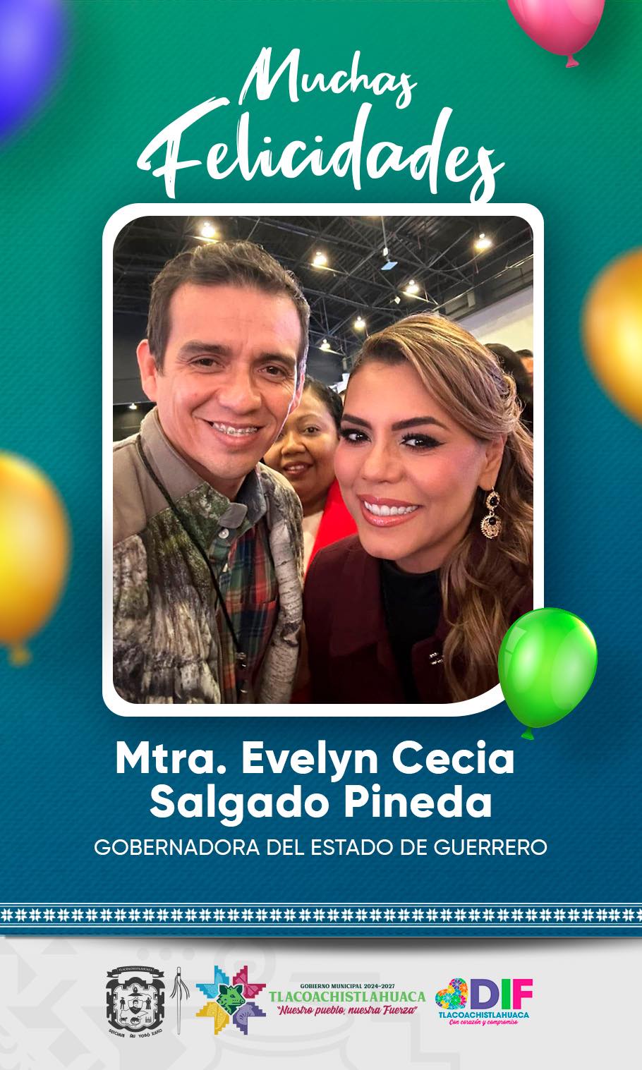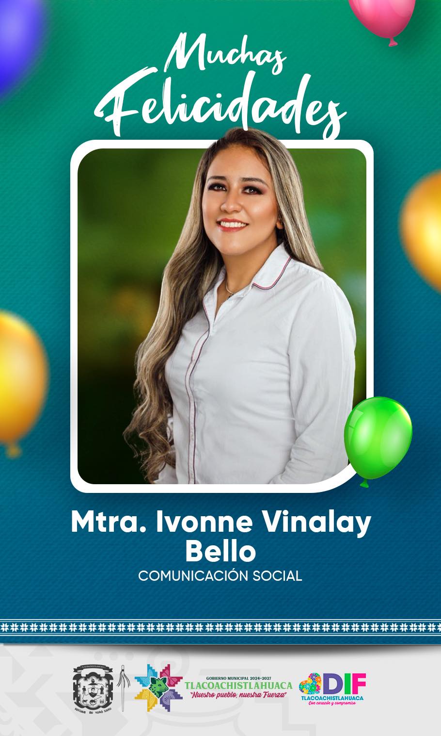 El Gobierno Municipal de Tlacoachistlahuaca que preside el Arq. Emmanuel Cuevas Rodríguez felicita con aprecio a la Mtra. Ivonne Vinalay Bello, responsable del área de Comunicación Social, con motivo de su cumpleaños.