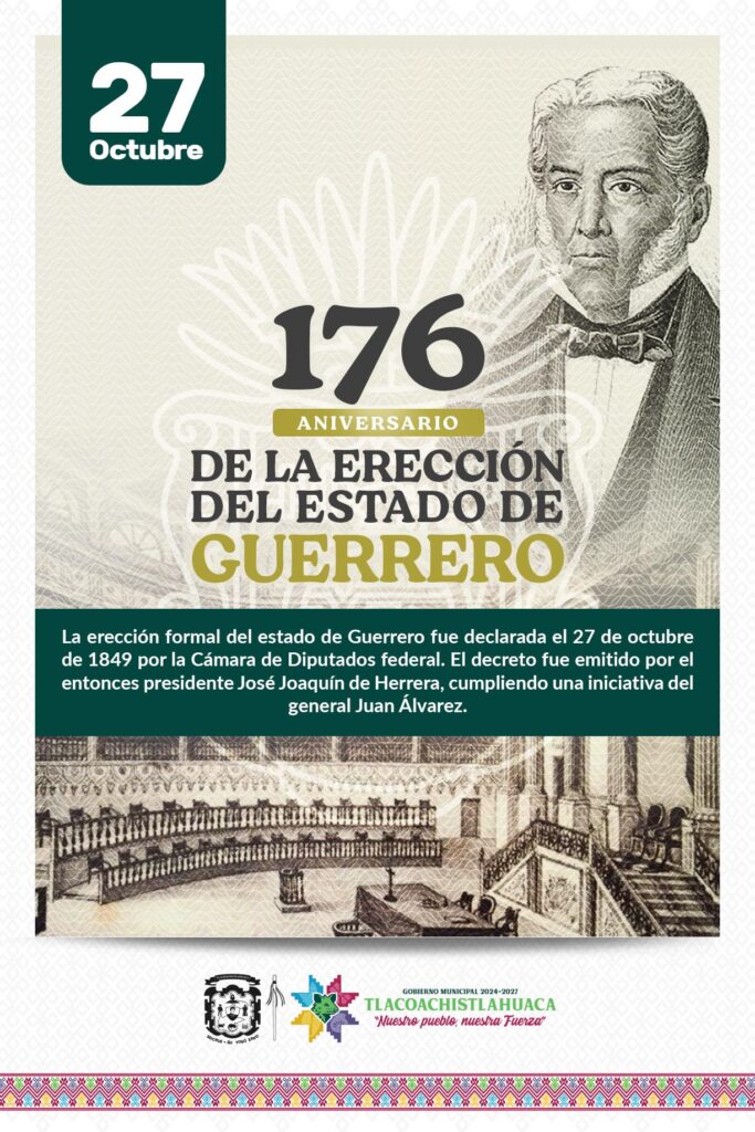 Hoy, 27 de octubre, conmemoramos con orgullo el 176 aniversario de la erección del Estado de Guerrero, una fecha que nos recuerda el valor, la lucha y el espíritu de nuestros antepasados que soñaron con una tierra libre, justa y soberana.
