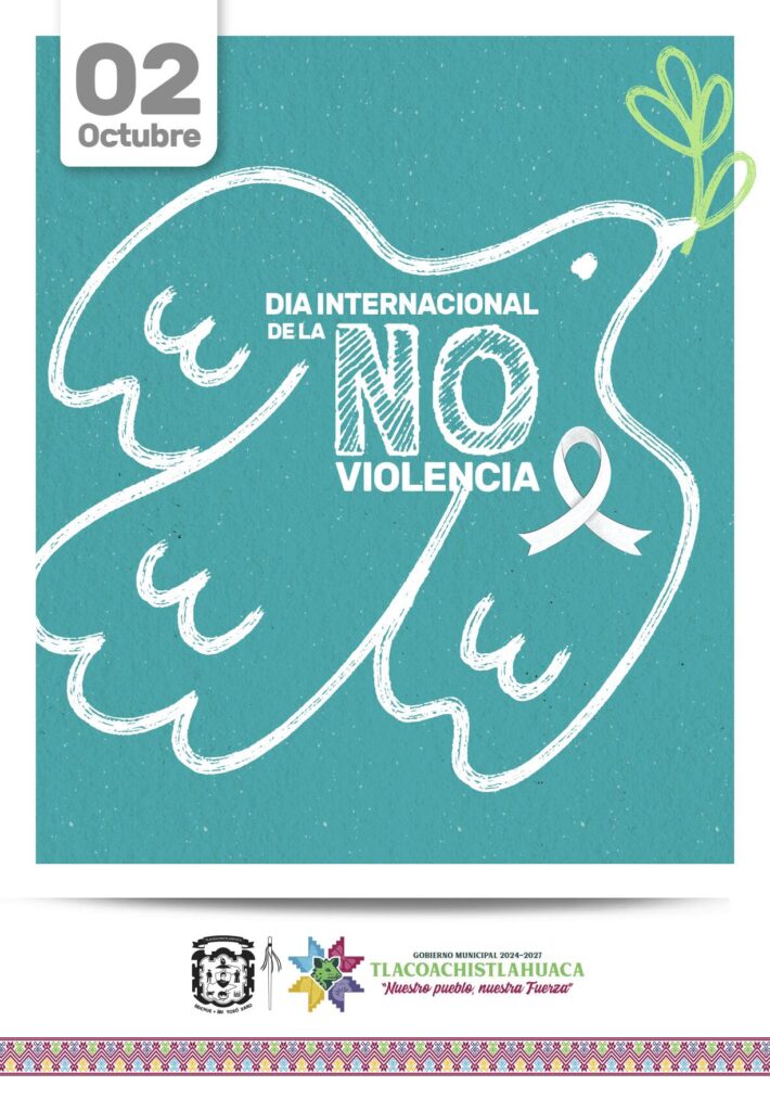 Este 2 de octubre, el Gobierno de Tlacoachistlahuaca se suma al llamado global por la paz, conmemorando el Día Internacional de la No Violencia, una fecha que nos invita a reflexionar sobre la importancia del respeto, el entendimiento mutuo y la solución pacífica de los conflictos.