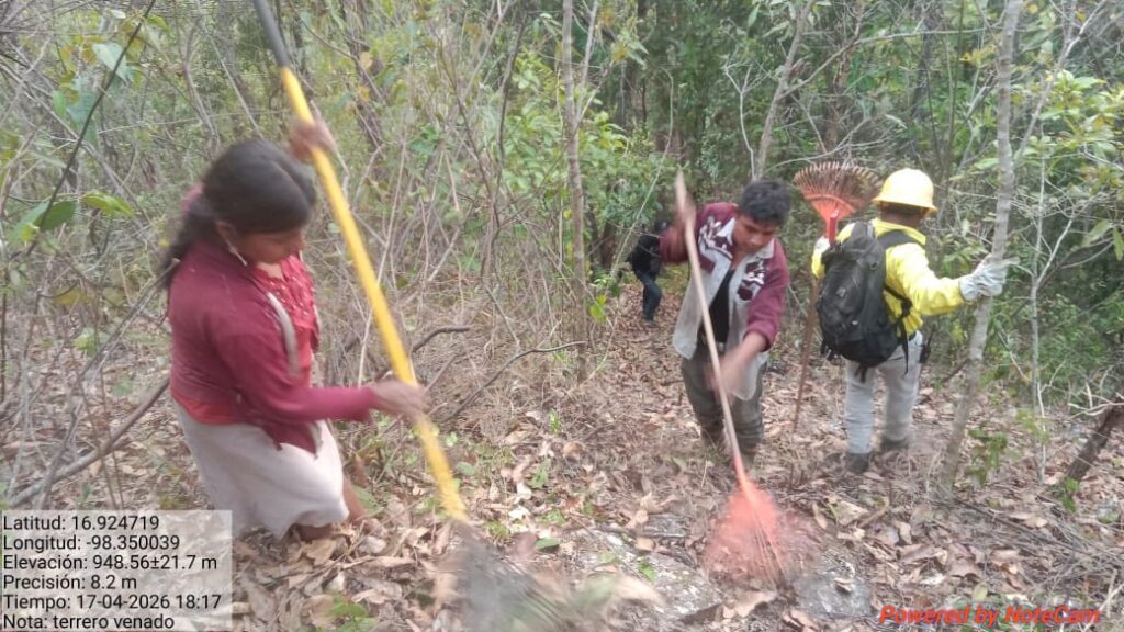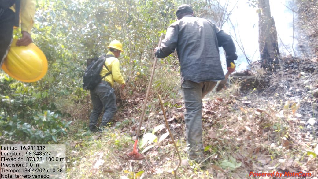 La brigada trabaja en coordinación con voluntarios, manteniendo activa la operación en Terrero Venado, municipio de Tlacoachistlahuaca, logrando avances importantes en el control del incendio.