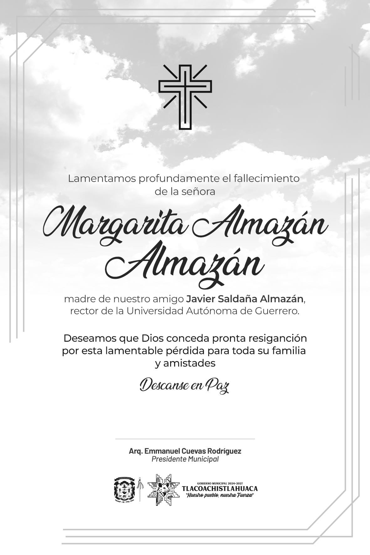 El Gobierno de Tlacoachistlahuaca que preside el Arq. Emmanuel Cuevas Rodríguez expresa sus más sinceras condolencias por el fallecimiento de la Sra. Margarita Almazán Almazán, madre del rector de la Universidad Autónoma de Guerrero, Dr. Javier Saldaña Almazán.
