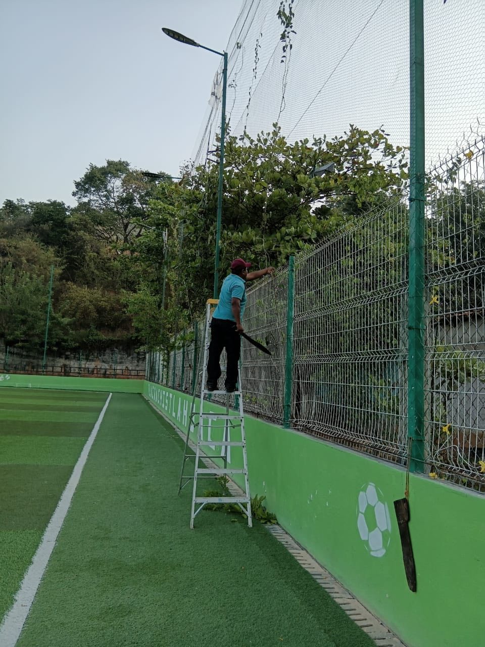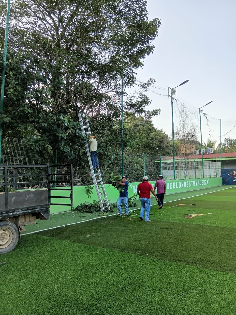Siguiendo las indicaciones del presidente municipal, Arq. Emmanuel Cuevas Rodríguez, la Coordinación de Servicios Generales realizó trabajos de poda de arbustos que afectaban la malla del campo de fútbol del Barrio Chino.
