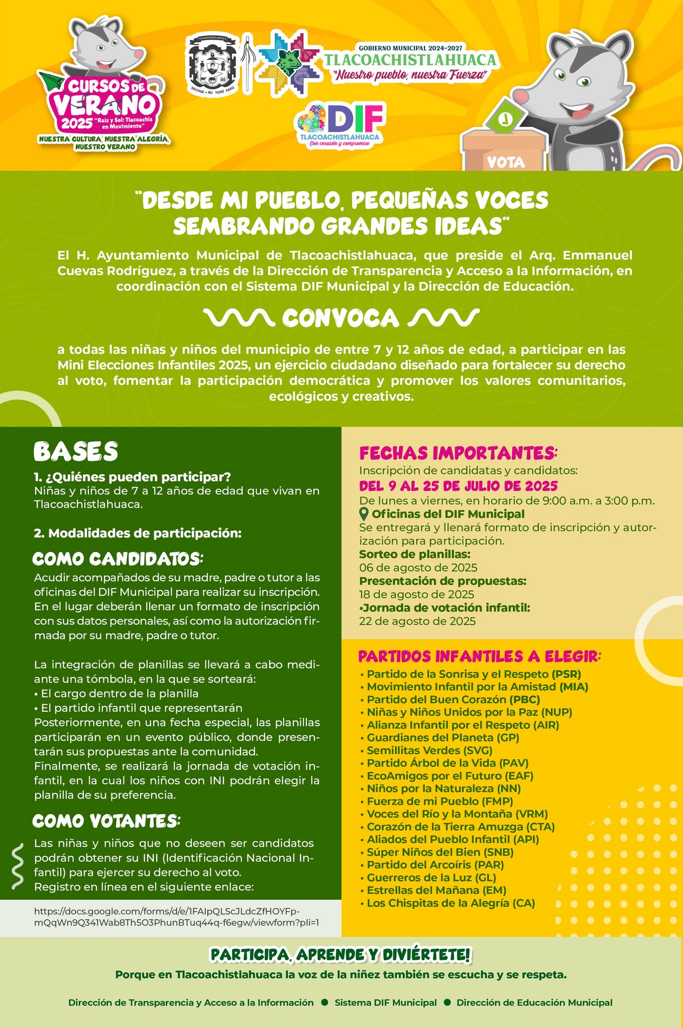 📢 CONVOCA a todas las niñas y niños del municipio, de entre 7 y 12 años de edad, a participar en las Mini Elecciones Infantiles 2025.