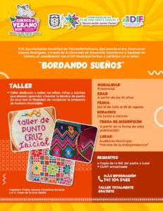 El H. Ayuntamiento de Tlacoachistlahuaca, a través de la Dirección de Desarrollo Económico y Equidad de Género, invita a niñas, niños y adolescentes a sumarse a este espacio creativo donde podrán aprender, convivir y expresarse mediante el arte del bordado.