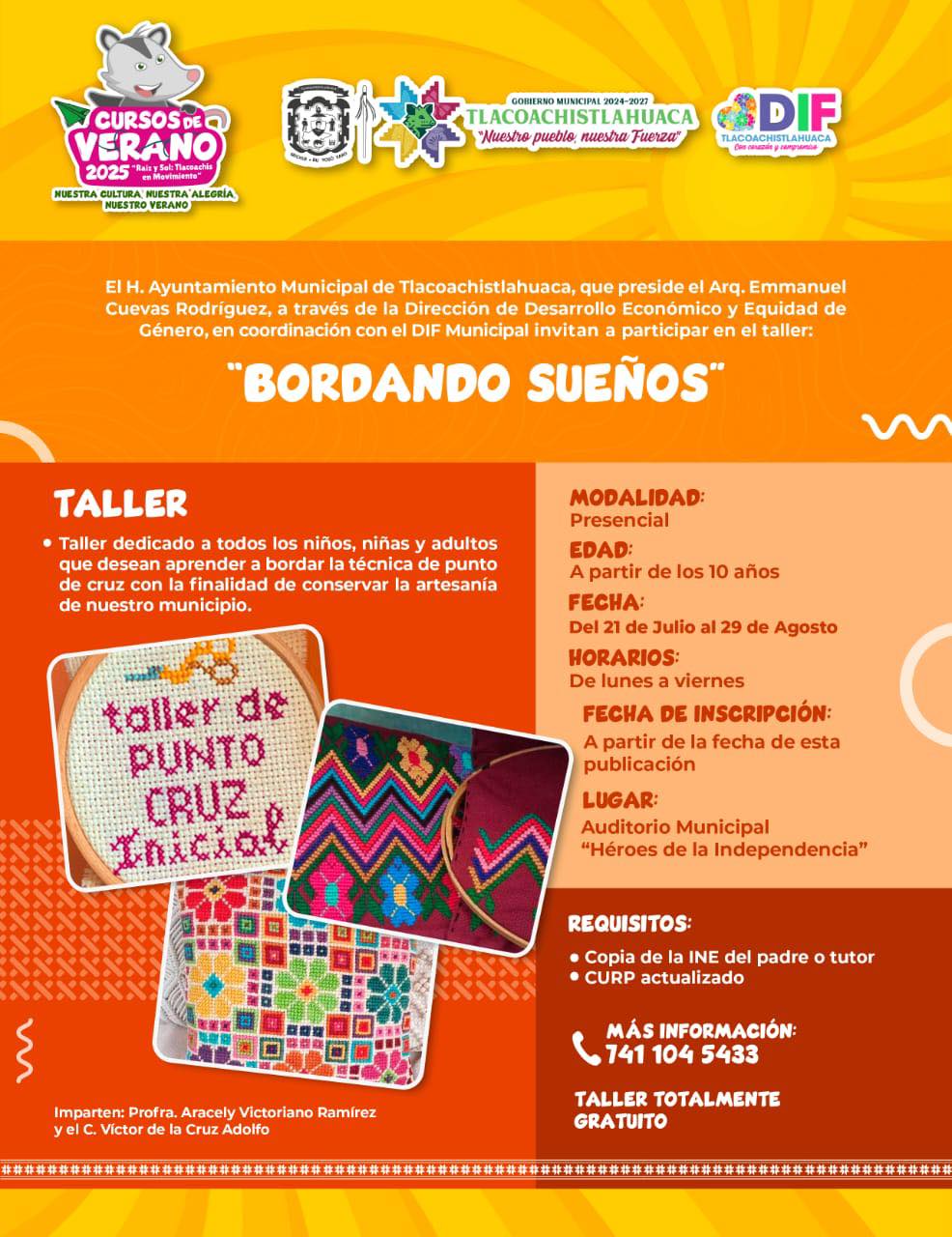 El H. Ayuntamiento de Tlacoachistlahuaca, que encabeza el Arq. Emmanuel Cuevas Rodríguez, a través de la Dirección de Desarrollo Económico y Equidad de Género, en coordinación con el DIF Municipal, invitan cordialmente a niñas, niños y adolescentes a participar en el taller “Bordando Sueños”.