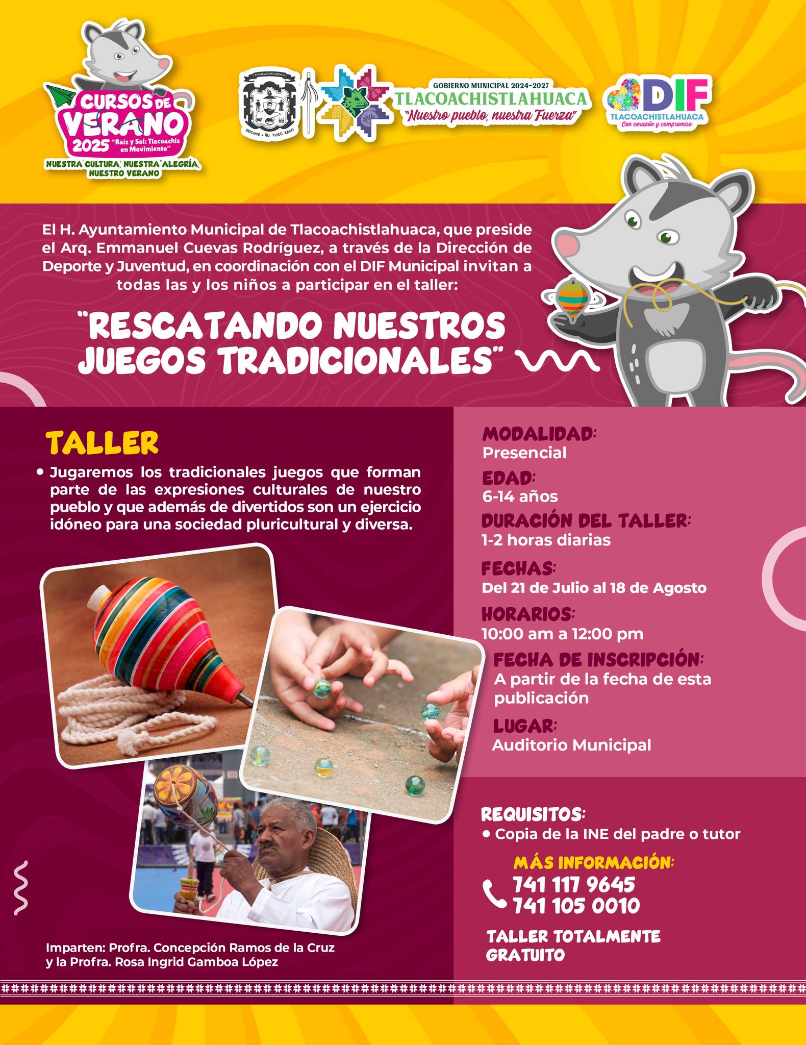 El H. Ayuntamiento de Tlacoachistlahuaca, que preside el Arq. Emmanuel Cuevas Rodríguez, a través de la Dirección de Deporte y Juventud, continúa desarrollando con entusiasmo el curso de verano “Rescatando Nuestros Juegos Tradicionales”, con el objetivo de preservar nuestro patrimonio cultural, fomentar valores y generar momentos de diversión que fortalezcan nuestra identidad como comunidad.