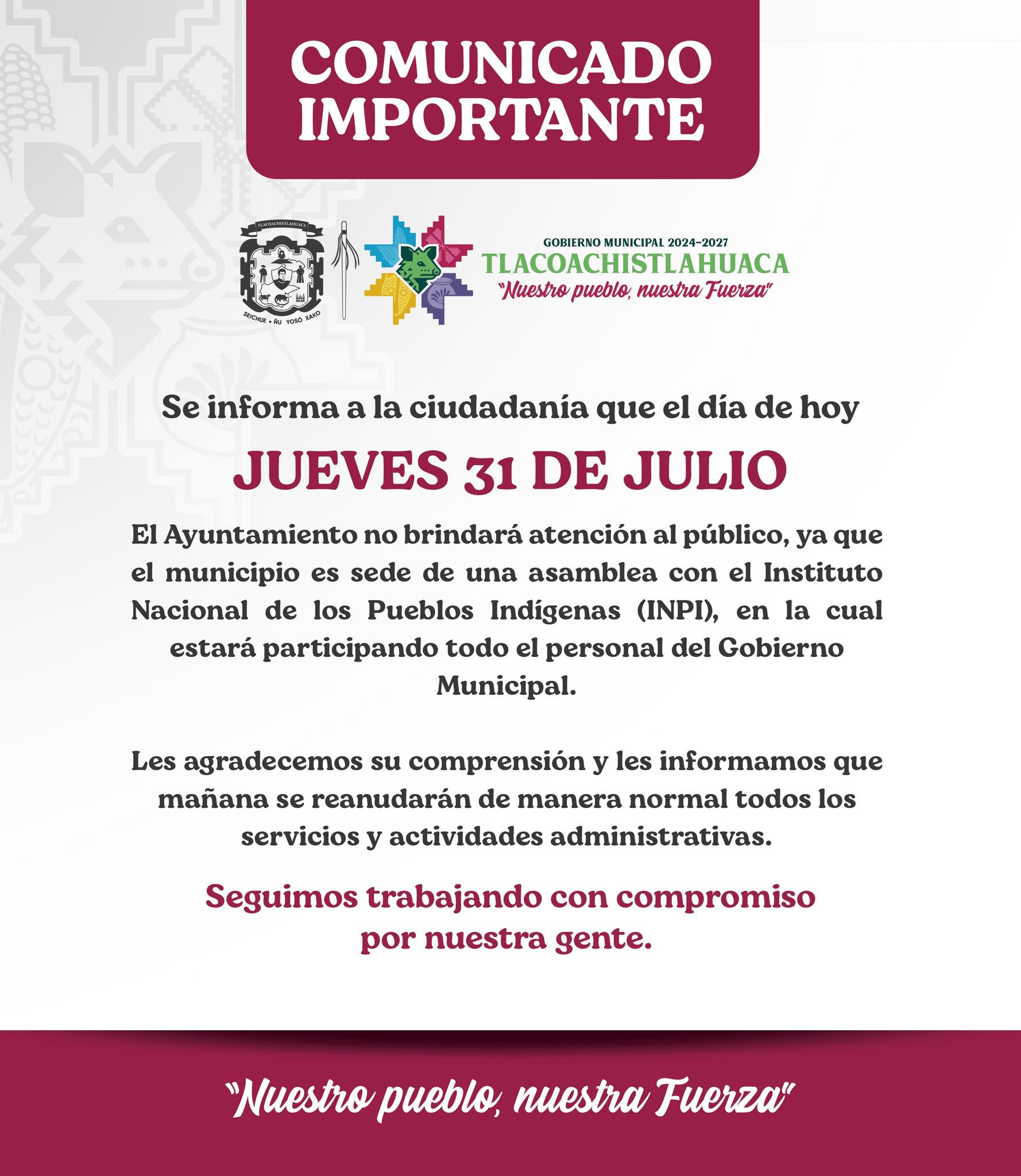 Hoy no habrá atención en el Ayuntamiento de Tlacoachistlahuaca, ya que somos sede de una asamblea con el INPI y todo el personal se encuentra participando.